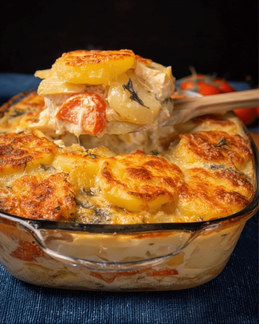 Some dishes don’t need introductions—they make their presence known the moment they leave the oven. The aroma of roasted chicken, caramelized potatoes, and bubbling cheese is enough to draw everyone to the kitchen. This Baked Chicken and Potato Casserole with Tomatoes and Cheese is exactly that kind of meal: heartwarming, rustic, and irresistibly savory.