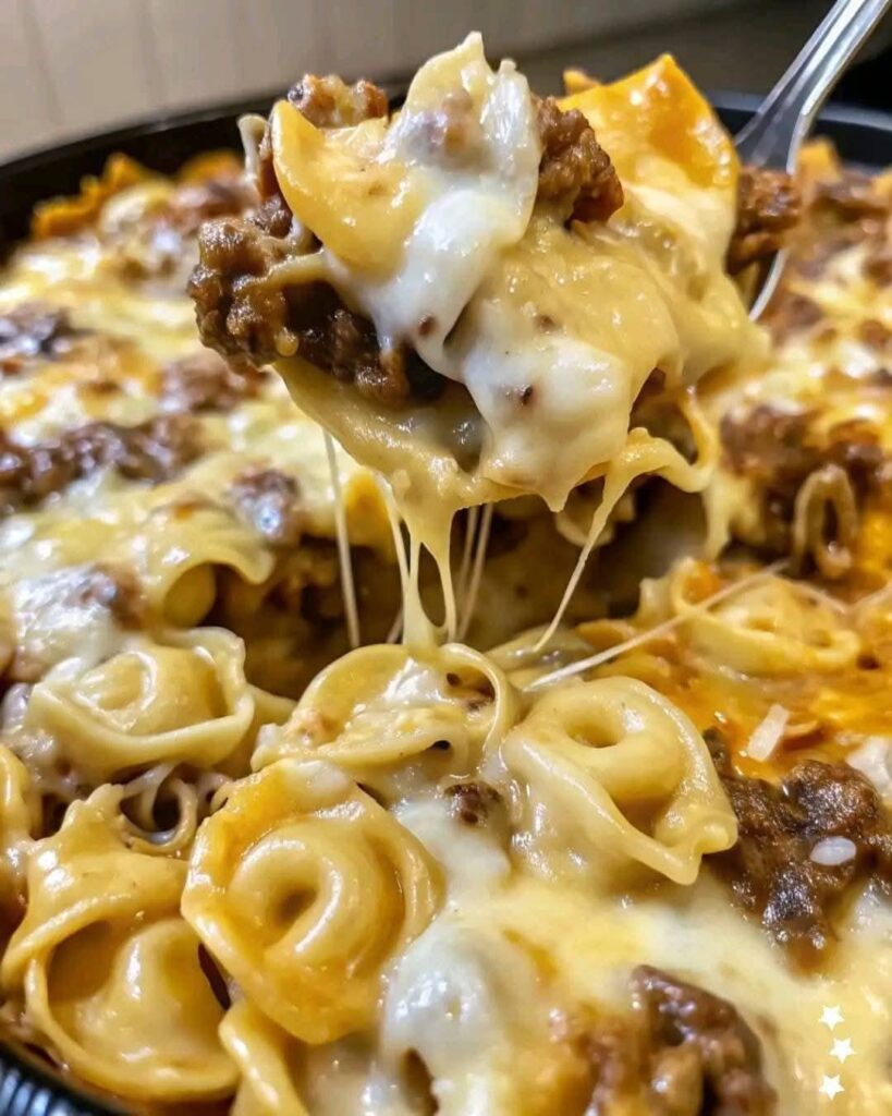 This recipe is a perfect fusion of American and Italian comfort foods — tender beef, caramelized onions, sautéed peppers, and pillowy cheese-filled tortellini, all bathed in a silky provolone cheese sauce. It’s hearty, satisfying, and absolutely irresistible.