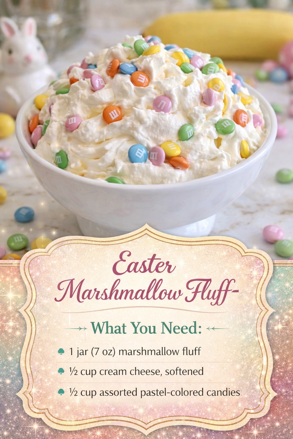 Marshmallow fluff is a smooth, spreadable confection with a texture somewhere between whipped cream and melted marshmallows. For Easter, it’s often enhanced with soft colors, vanilla notes, and fun toppings to create a festive, dessert-like dip or frosting.
