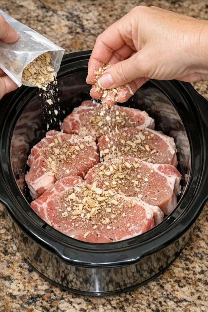 Sprinkle the onion soup mix over the pork roast.
