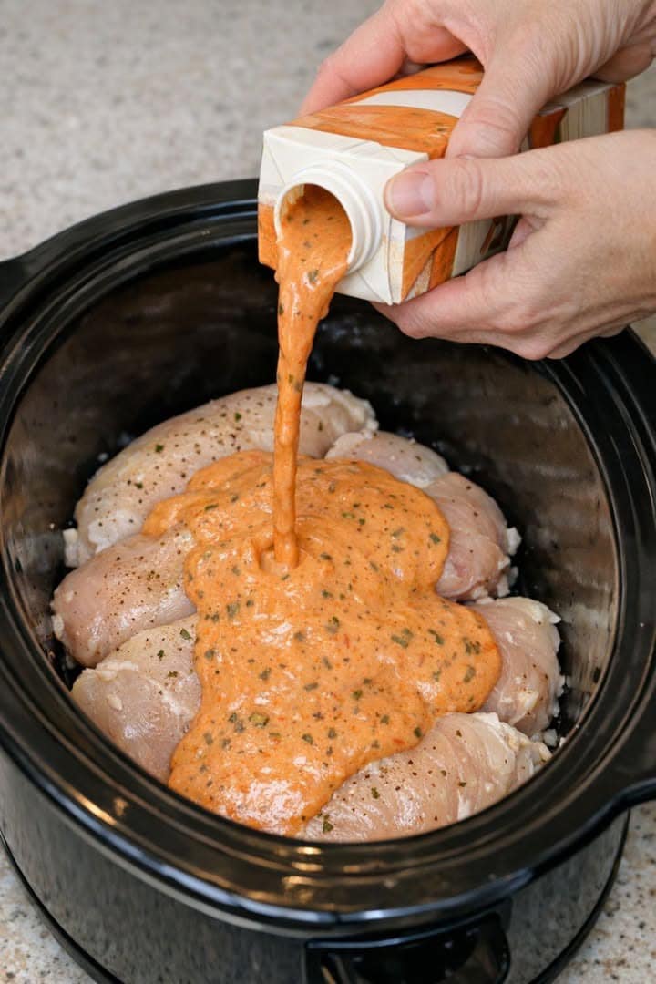 Cover and cook on low for 6–7 hours or high for 3–4 hours, until the chicken is tender and fully cooked. - Add Cream Cheese and Basil